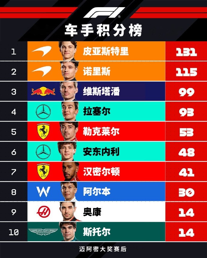 经过这一轮角逐,车手积分榜上出现了有趣的变化。迈凯伦的两位车手皮亚斯特里和诺里斯如今分别占据了积分榜的前两位,皮亚斯特里凭借131分稳居榜首,而诺里斯也以115分紧随其后。紧接着的是维斯塔潘、拉塞尔和勒克莱尔,他们分别站在了第三到第五的位置,形成了一股强大的竞争势头。