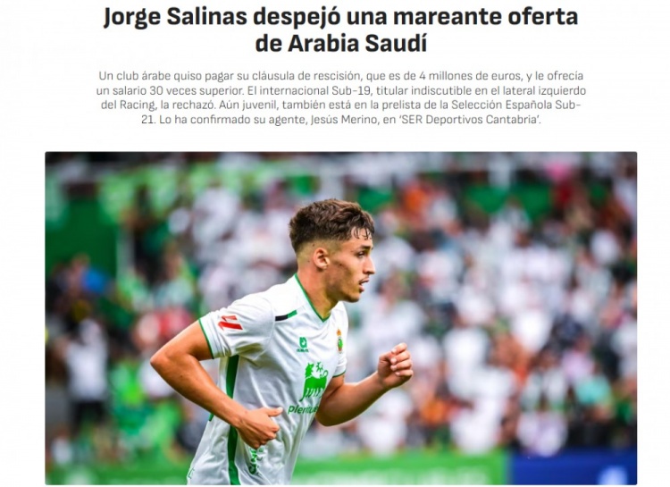 近日,18岁的西班牙U19国脚乔治·萨利纳斯成为媒体关注的焦点,因为他拒绝了一份来自沙特俱乐部的丰厚报价。该俱乐部不仅愿意支付高达400万欧元的解约金,还提出了一份薪资相比于他在桑坦德竞技队的收入整整多出30倍的合同。然而,尽管面对如此诱人的条件,萨利纳斯还是选择了继续留在桑坦德竞技,追求自己的职业梦想。