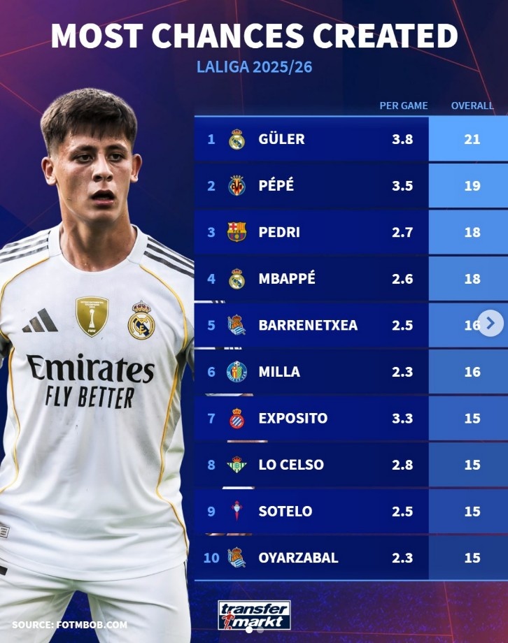 本赛季西甲机会创造者排行榜:居勒尔以21次高居首位,佩德里和姆巴佩紧随其后_西甲直播