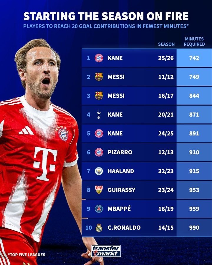 季初最快造20球的球员排名中,紧随其后的是梅西,曾在2011-12赛季和2016-17赛季分别用749分钟和844分钟创下相近的记录。此外,凯恩的早期表现也显示出他在2020-21赛季当时为热刺所用的871分钟以及2024-25赛季为拜仁创造的891分钟记录,这些都突显出他在职业生涯各阶段的高效表现。