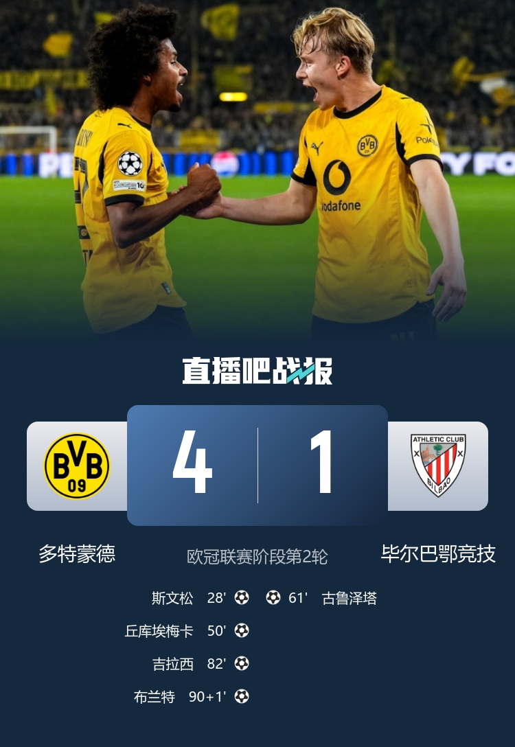 欧冠赛场上演大逆转 多特球队以四一击败毕尔巴鄂 丘库埃梅卡闪耀聚勒失足吉拉西也有进账_欧冠直播