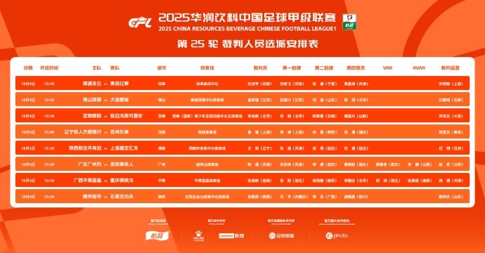 2025华润饮料中甲联赛第25轮即将来临,裁判选派名单已正式公布,此次比赛尤其吸引眼球的便是两场争夺名次的关键战役,其中广东广州豹对阵深圳青年人和广西平果迎战重庆铜梁龙的比赛均配备了VAR裁判,旨在确保比赛的公正性与公平性。