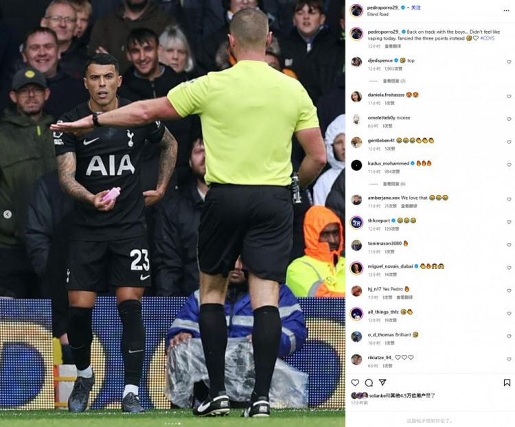 在比赛进行中,热刺球员波罗在开角球时,被坐在看台上的利兹联球迷投掷的电子烟击中。与此同时,另一个热刺球员库杜斯在打入制胜球后的庆祝时,一瓶饮料险些撞上他的面庞,这一幕通过电视画面清晰记录下来,令人心惊。