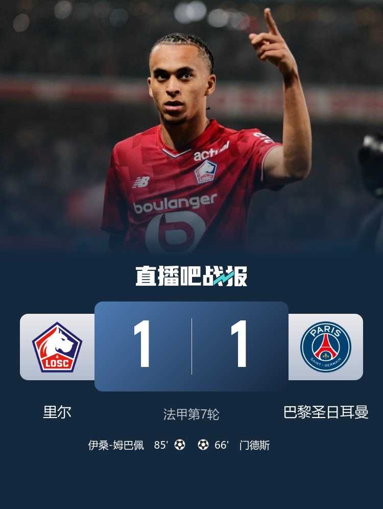 10月6日,北京时间2:45,法甲第7轮的比赛中,里尔主场迎战巴黎圣日耳曼。比赛上半场,双方都未能创造出有威胁的进攻机会。进入下半场,替补出场的努诺-门德斯在第66分钟为巴黎送上一脚精彩的任意球破门,帮助球队取得领先;而姆巴佩也现身观众席为弟弟伊桑-姆巴佩加油。最终,伊桑在第85分钟为里尔打入扳平进球,比赛以1-1的平局收场。