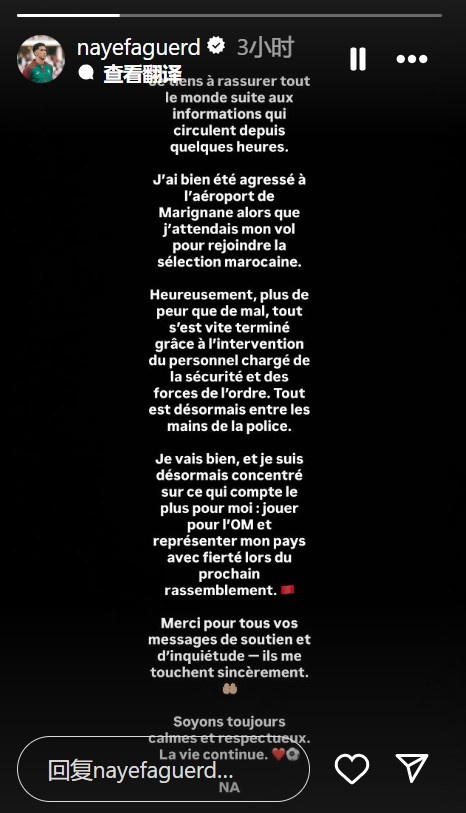 他表示,尽管经历了一次令人惊恐的事件,但很庆幸自己没有受到太大伤害,并强调在安保人员和执法部门的迅速干预下,事态得以迅速平息。他补充道:“目前一切已交由警方处理,我状态良好,已经把注意力重新聚焦在更重要的事情上,那就是为马赛效力,同时自豪地代表祖国参加即将到来的国家队集训。”