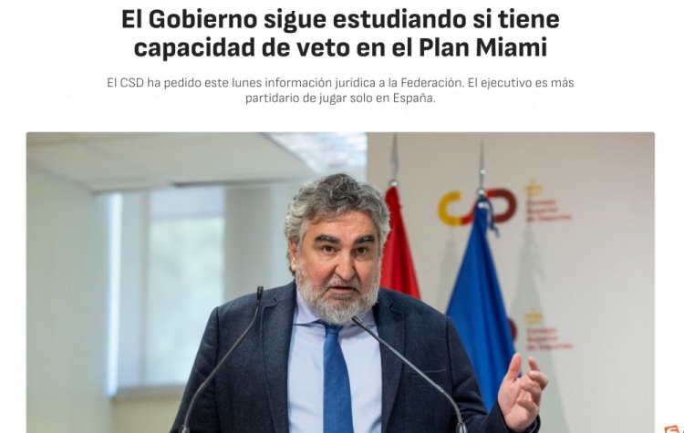通过上述行动,西班牙高等体育委员会旨在明确自身是否有权对该项目做出否定决定。尽管在之前几乎所有相关方均认为此事不在政府职权范围之内,因为通常认为政府的审批只适用于在西班牙境内进行的国际赛事,例如2030年世界杯、欧冠决赛等,但现在的形势依然不明朗,政府正在进一步研究是否有权最终决定。