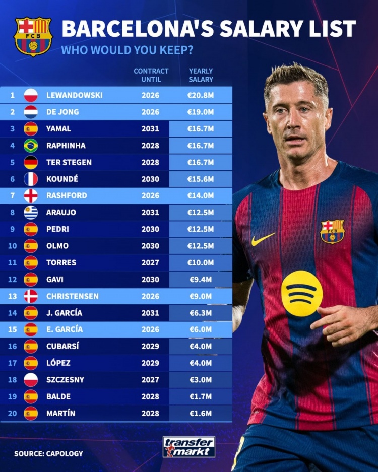 德转公布巴萨年薪排名 莱万以2080万欧元位居第一 德容以1900万欧元排在第二_西甲直播