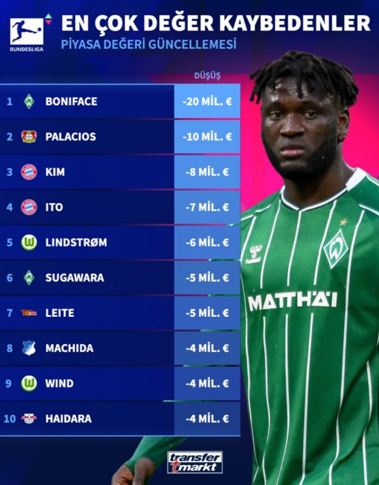 德国转会市场于10月15日最新发布了德甲球员的身价变动情况,令人瞩目的是,博尼法斯的身价骤降2000万欧元,成为跌幅最大的球员。而帕拉西奥斯紧随其后,跌幅则为1000万欧元,排在榜单第二位。